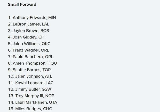 40岁老詹依旧高居小前锋第2位!在各支球队步入新赛季训练营之际,美媒《bleacherreport》结合当下能力公布出现役各位置TOP15名单,其中哈登分卫第4,库里控卫第8,火箭队阿门一人摇摆入选3位置前十五。