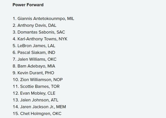 11-15名:小贾伦杰克逊、切特、恩比德、特纳、杰伦杜伦。